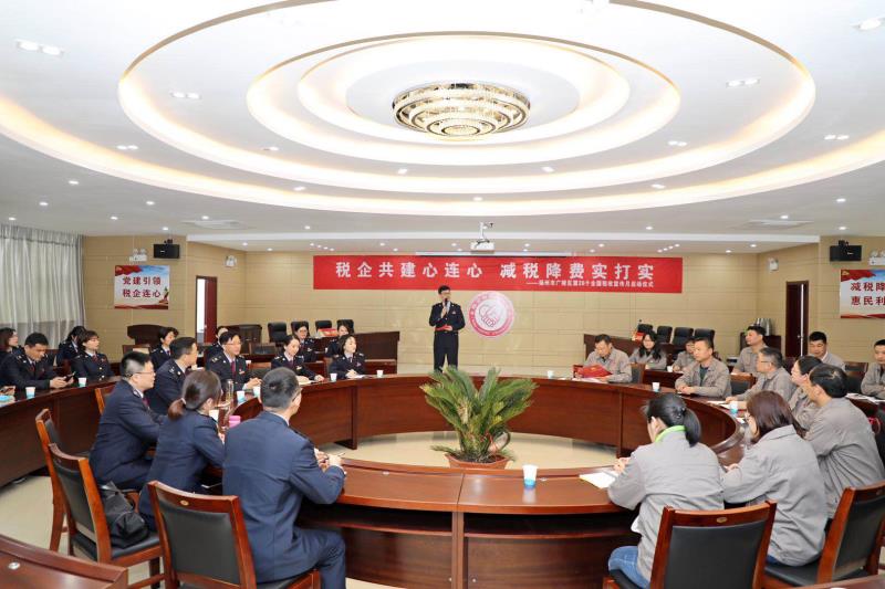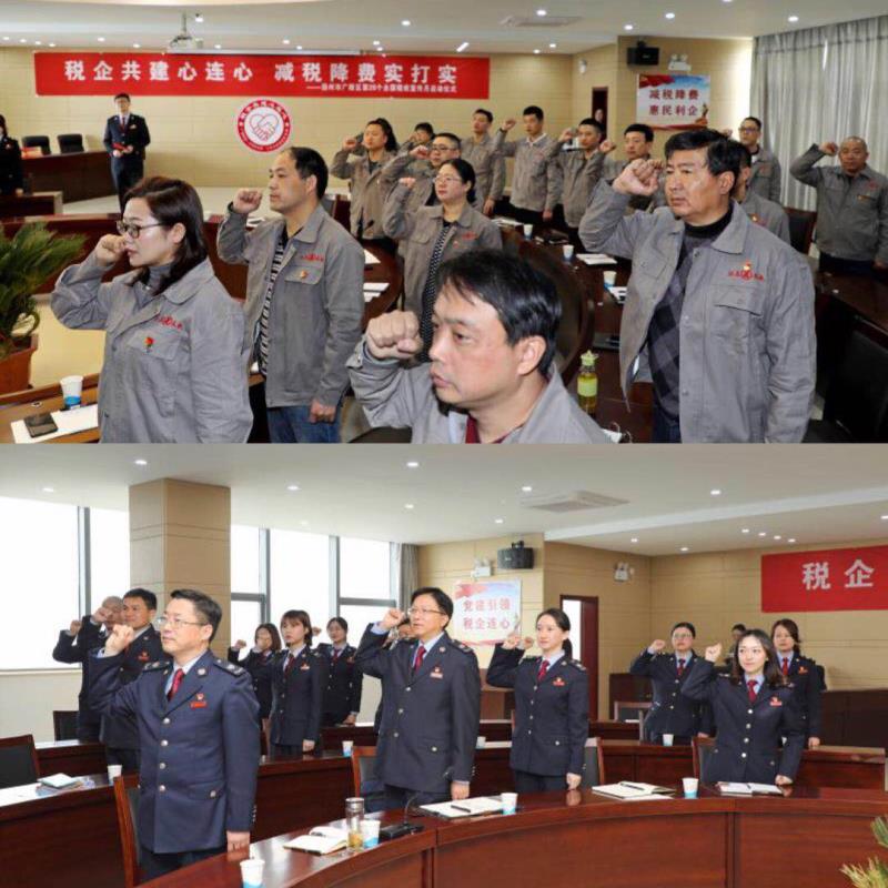 2019年全國兩會剛剛落下帷幕,3月28日上午,廣陵區(qū)第28個全國稅收宣傳月啟動儀式和稅企共建活動在我公司隆重舉行;顒右浴岸惼蠊步ㄐ倪B心減稅降費實打?qū)崱睘橹黝},廣陵區(qū)稅務局局長樊正軍、副局長王正軍、廣陵區(qū)第一分管局局長邱嵩、總公司財務總監(jiān)楊紅霞、我公司財務總監(jiān)章勇、廣陵第一稅務局黨支部、本司第四黨支部全體黨員共同參加本次活動。